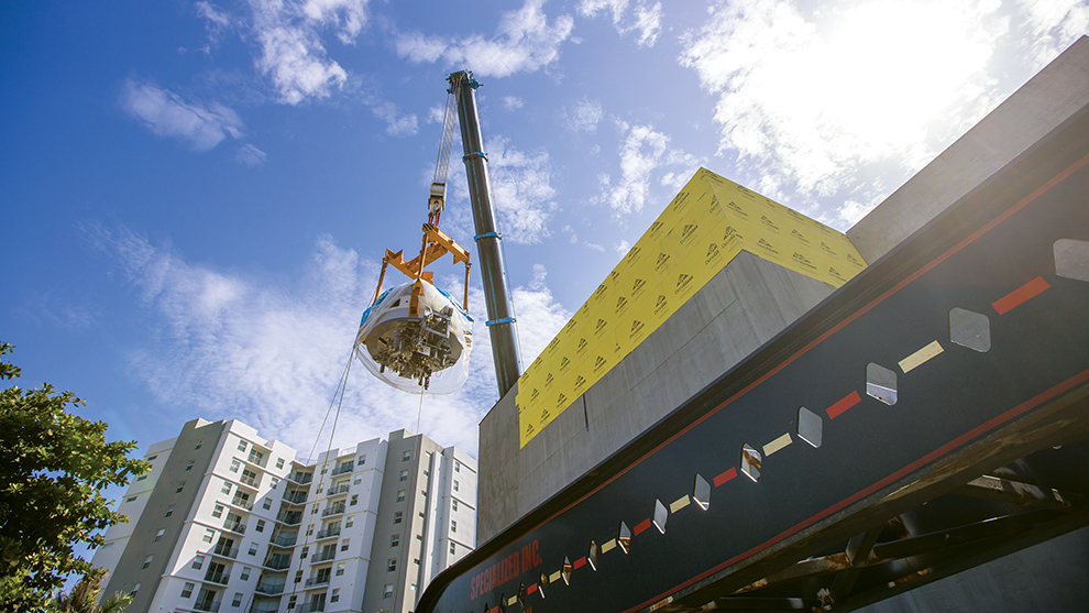 Installing the cyclotron is no easy task. Crews transported the cyclotron from Europe and loaded it via crane through Sylvester’s roof. The device weighs 90 tons and produces a proton beam that travels two-thirds the speed of light, targeting cancerous tissue while minimizing radiation exposure to surrounding healthy tissue.