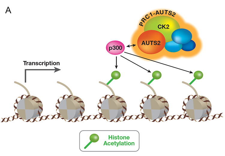 Mammalian PRC1 complex comprises a subset of Polycomb group (PcG) proteins that maintain transcriptional repression programs. Our proteomic analyses revealed that PRC1 complexes actually form minimally six major families. Characterizing the distinct composition of each family revealed that two sub-families (PRC1-AUTS2) contain three novel, non-PcG constituents: 1) AUTS2, 2) the transcription co-activator P300, and 3) the protein kinase CK2. AUTS2 is often disrupted in patients with neuronal disorders, yet the mechanism underlying such pathogenesis is unclear. Contrary to the well-established role of PRC1 in repression, PRC1-AUTS2 unexpectedly activates gene expression. The mechanistic basis of this phenomenon involves CK2-mediated inhibition of PRC1 repression and AUTS2-mediated recruitment of the transcription coactivator, P300. The recruited P300 facilitates transcription in part by acetylating the histones (Figure A, below).