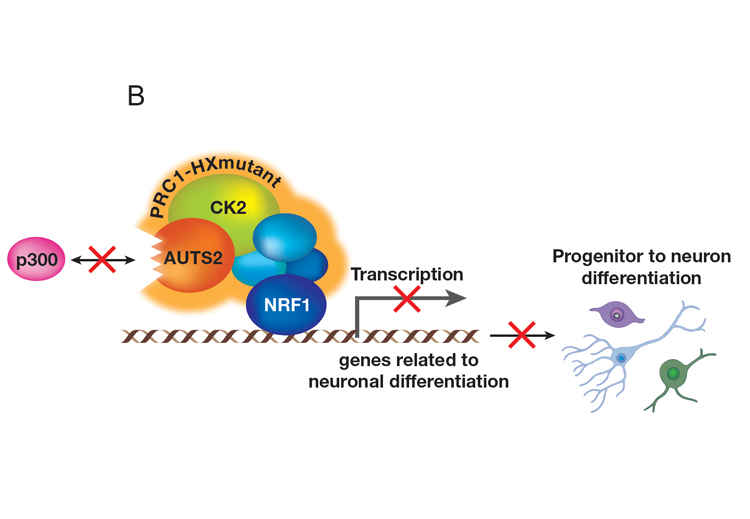 Our findings pointed to the role of AUTS2 in positively regulating the central nervous system (CNS) transcriptional program: conditional targeting of AUTS2 in the mouse CNS led to various developmental defects. Our latest findings demonstrate that patients harboring mutations in the HX repeat domain of AUTS2 protein exhibit defects in AUTS2 interaction with P300, as well as a developmental disorder reflective of Rubinstein-Taybi syndrome. The absence of AUTS2 or mutation in its HX repeat domain gives rise to a mis-regulation of a subset of developmental genes and curtails motor neuron differentiation of mouse embryonic stem cells. Moreover, the transcription factor, Nuclear Respiratory Factor 1 (NRF1) exhibits a novel and integral role in the normal neurodevelopmental process by recruiting PRC1-AUTS2 to chromatin (Figure B, above).