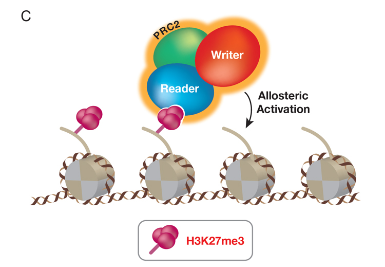 Mammalian PRC2 complex comprises a subset of PcG proteins different from those of PRC1.  PRC2 catalyzes tri-methylation of lysine 27 of histone H3 (H3K27me3), which is associated with repressed chromatin. Previously, we discovered that PRC2 binds to its own catalytic product, H3K27me3, resulting in its allosteric activation and promoting its further catalysis of H3K27me3. This “write and read” mechanism is instrumental to the generation of extensive, repressed regions of chromatin containing H3K27me3 in the cells. Key to PRC2 function is its recruitment to the proper chromatin sites. We designed an in vivo system to capture PRC2 in action as it establishes de novo its repressive chromatin domains. A subunit of PRC2 was genetically deleted such that endogenous PRC2 and H3K27me3 levels were depleted in these cells. This subunit is then inducibly re-expressed such that the initial presence of PRC2 and its activity on chromatin can be tracked. The initial and primary PRC2 recruitment sites correspond to the promoters of developmental genes and through knockout experiments, we identified which of its partner proteins are required for PRC2 recruitment. By tracking PRC2 and its catalysis of H3K27me3 in chromatin in this manner, the requirement for the PRC2 “write and read” mechanism for spreading H3K27me3 is evident.  This system can be adapted to differentiating cells wherein PRC2 is critical for lineage integrity and its recruitment might entail other important partner proteins yet to be identified (Figure C, below).