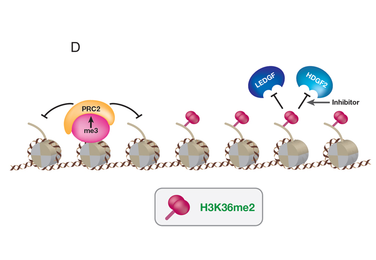 In DIPG harboring H3K27M, H3K36me2 now replaces H3K27me3 in normally repressed chromatin regions.  LEDGF and HDGF2 are possible targets for therapeutic treatment of DIPGs as they bind to H3K36me2 and facilitate transcription.