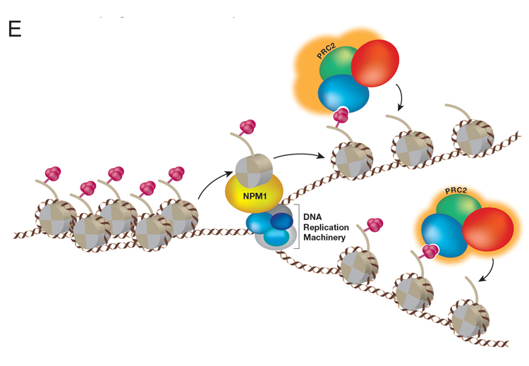 Of great importance to our future studies of NPM1 is its oncogenic potential. NPM1 mutations altering human NPM1 protein at its C-terminus (NPM1c), displace NPM1 from its normal locales, the nucleolus and nucleoplasm, to the cytoplasm. NPM1c, is found in ~35% of all Acute Myeloid Leukemia (AML) with normal karyotype. Notably, NPM1c AML cells exhibit abnormal de-repression of the developmentally important HOX genes, resulting in HOX proteins driving leukemogenesis. Importantly, the best-studied and developmentally-relevant target genes of PRC2 are the HOX clusters. The loss of gene repression and dysregulation of epigenetic mechanisms are hallmarks of cancer. We speculate that an NPM1-PRC2 axis may be misregulated during the development of AML and are investigating the functional interplay between PRC2 and NPM1c during AML leukemogenesis (Figure F, above).