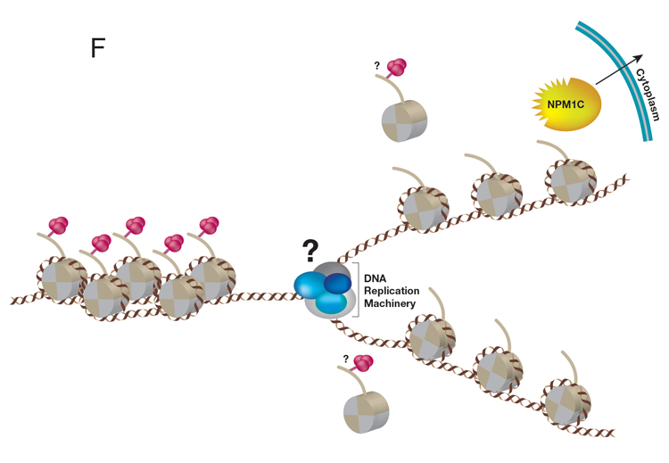 A naturally occurring NPM1 mutant, NPM1c, is associated with AML. NPM1c becomes sequestered in the cellular cytoplasm, which may be detrimental to the inheritance of repressed chromatin domains and thus, appropriate cellular identity. This scenario likely contributes to carcinogenesis.