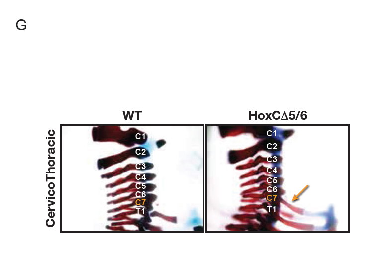 We sought to understand how PRC2 activity is closed off from actively transcribed genes and we found that CTCF is critical to this process: a single CTCF chromatin-binding event spatially organizes the HoxA cluster to shield PRC2 from neighboring regions of active gene expression during differentiation of mouse embryonic stem cells into cervical motor neurons. In accordance with the HOX clusters being paramount to development and the key role of CTCF in this process, deletion of this CTCF binding event disrupts the chromatin boundary such that active transcription invades the normally repressed domain, leading to homeotic transformations in the mouse (Figure G, below). Thus, CTCF functions to insulate repressed from active chromatin domains by establishing appropriate topological boundaries; of critical importance to proper differentiation.