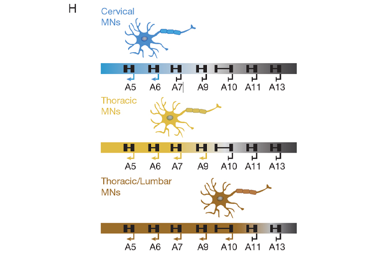 Shown here are genes (a5) to (a13) of the HoxA cluster in mouse. Arrowheads beneath the genes indicate the presence and direction of transcription and blocked arrows indicate gene repression. We identified novel insulators that function with CTCF to protect repressed chromatin from active chromatin invasion, ensuring the proper gene expression profile associated with different motor neuron (MN) cell-types. We propose that additional insulators contribute to other differentiation pathways during development.